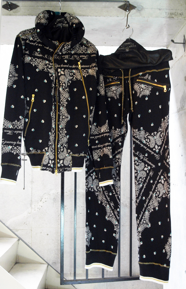 ジャンルやカテゴリーの垣根を取り払い、現世の世界中の素晴らしい音楽からインスピレーションを受け、コアなアーティストやファンに向けて、製作活動を続けるファッションブランドFranCisT_MOR.K.S. (フランシスト・モークス)と、ファッションディレクター・干場義雅氏が編集長を務めるファッション&ライフスタイルウエブマガジンFORZA STYLE のマルチエディター『サトシーノ』こと中本智士氏とのコラボレーションモデル第一弾は、ハイテンションストレッチベロアのトラックジャケットとイージーパンツのセットアップ。