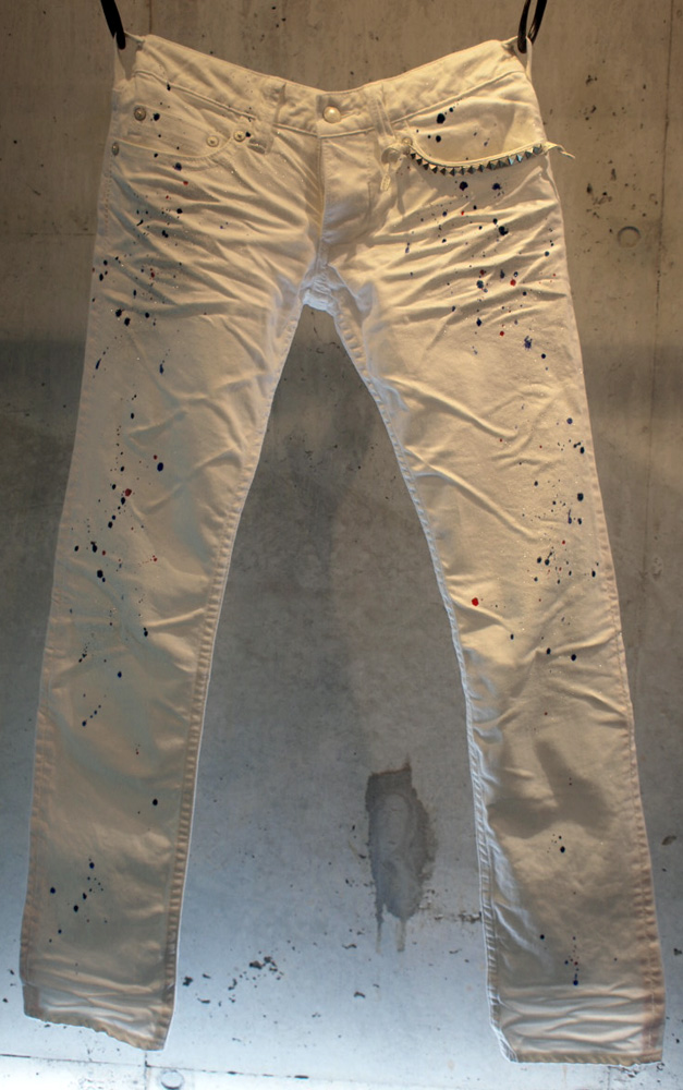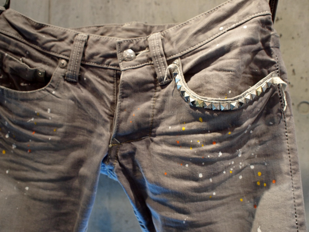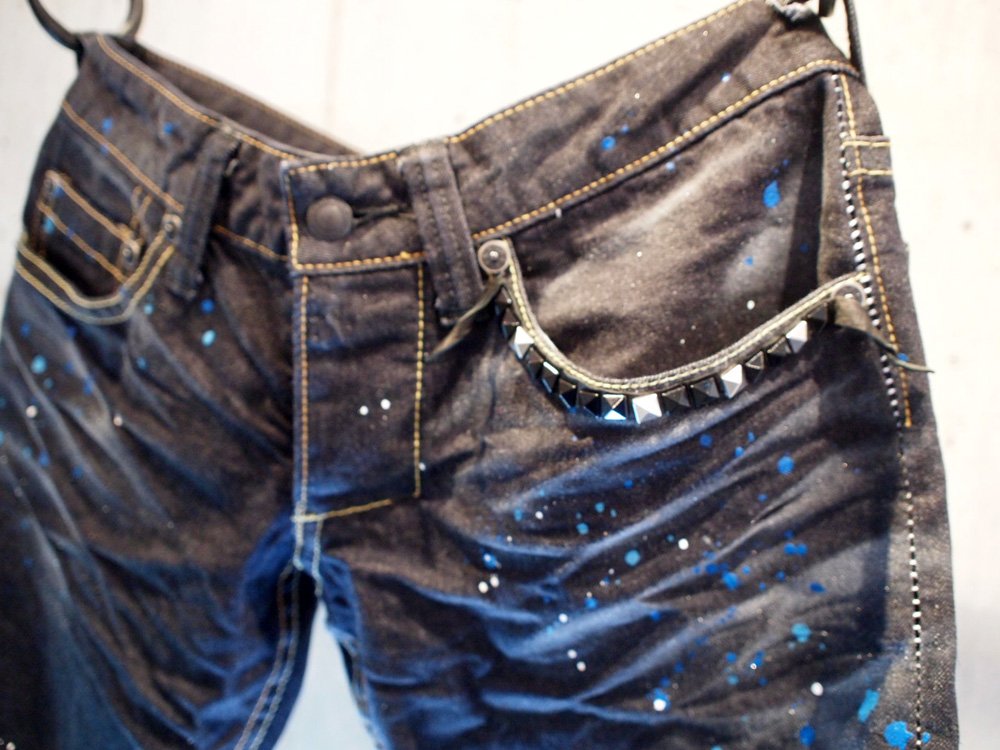 *ストレッチデニム、0番手ホワイトステッチ サイドシーム、ハンドペイント、シルバーメタリックスプレー、形状記憶皺加工、ビンテージステッチ、ホースレザー&ピラミッドスタッズ、裾チェーンステッチ、オリジナルWリベット。MOR.K.S.JEANS.拘りのディテール満載。