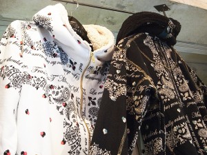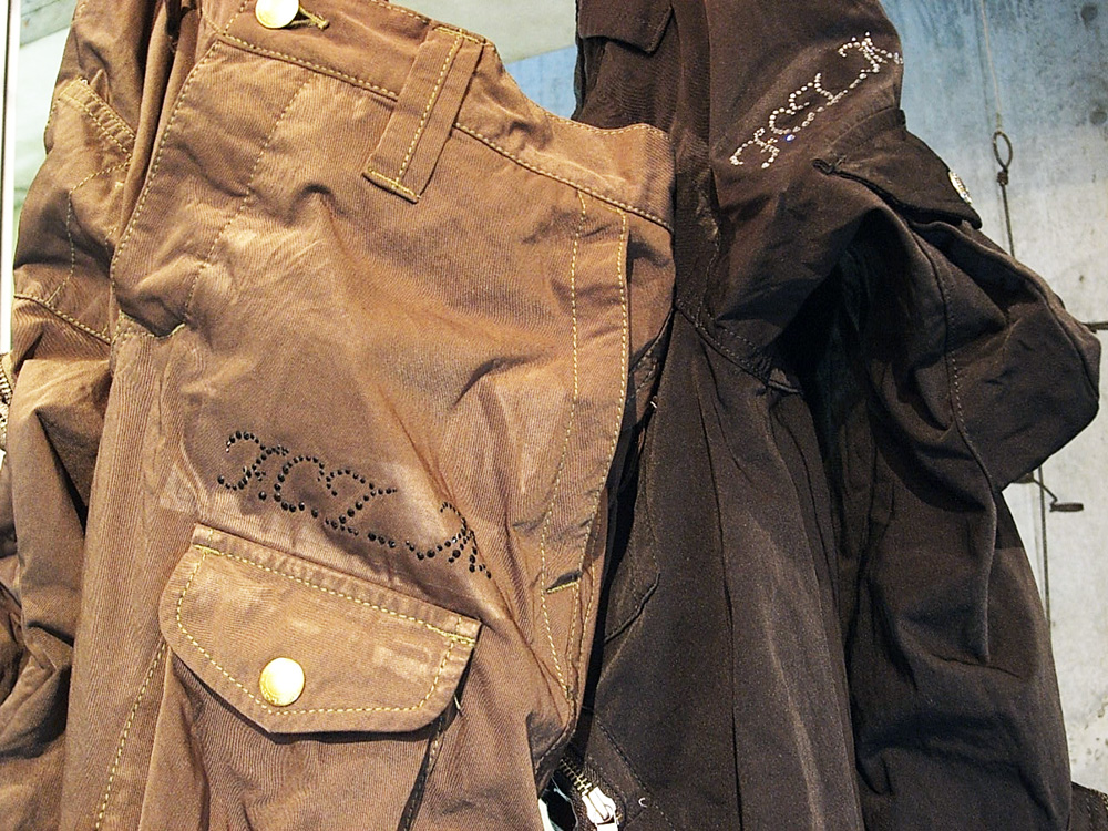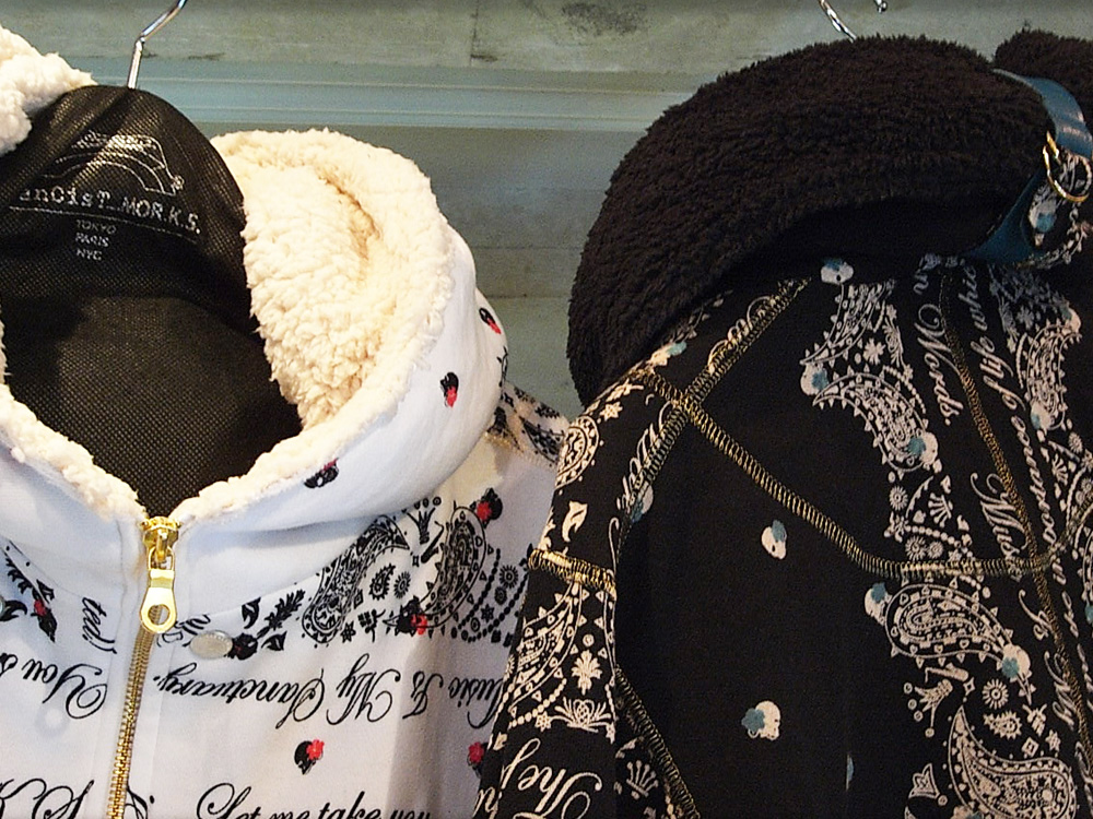トラックジャケットの襟裏、袖唇、裾切り替えをベロアを撫で毛方向に配置し、さりげなく光沢を放ちコントラストを出す仕掛けや、フロントジップには、FRANCIST_MOR.K.S.刻印入りワンスタースライダーと、エレメントは高級エクセラ逆開オープンのメタリックブラックを採用。