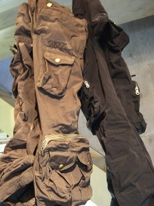 ジャケットと同仕様、ベルトパーツや腰ポケット口布には、ベロアを撫で毛方向に配置。さりげなく光沢が増しコントラストを放つ仕掛け。ダブルD冠抑えや後ろポケット口にはフランシスト・モークス定番ホースハイドレザーを採用。 履き心地は勿論、ボリューミーな腰から裾にかけての計算されたテーパードによるドレープが美しく、シルエットもパーフェクト!文句なしお勧めのニューラインイージーパンツが完成。